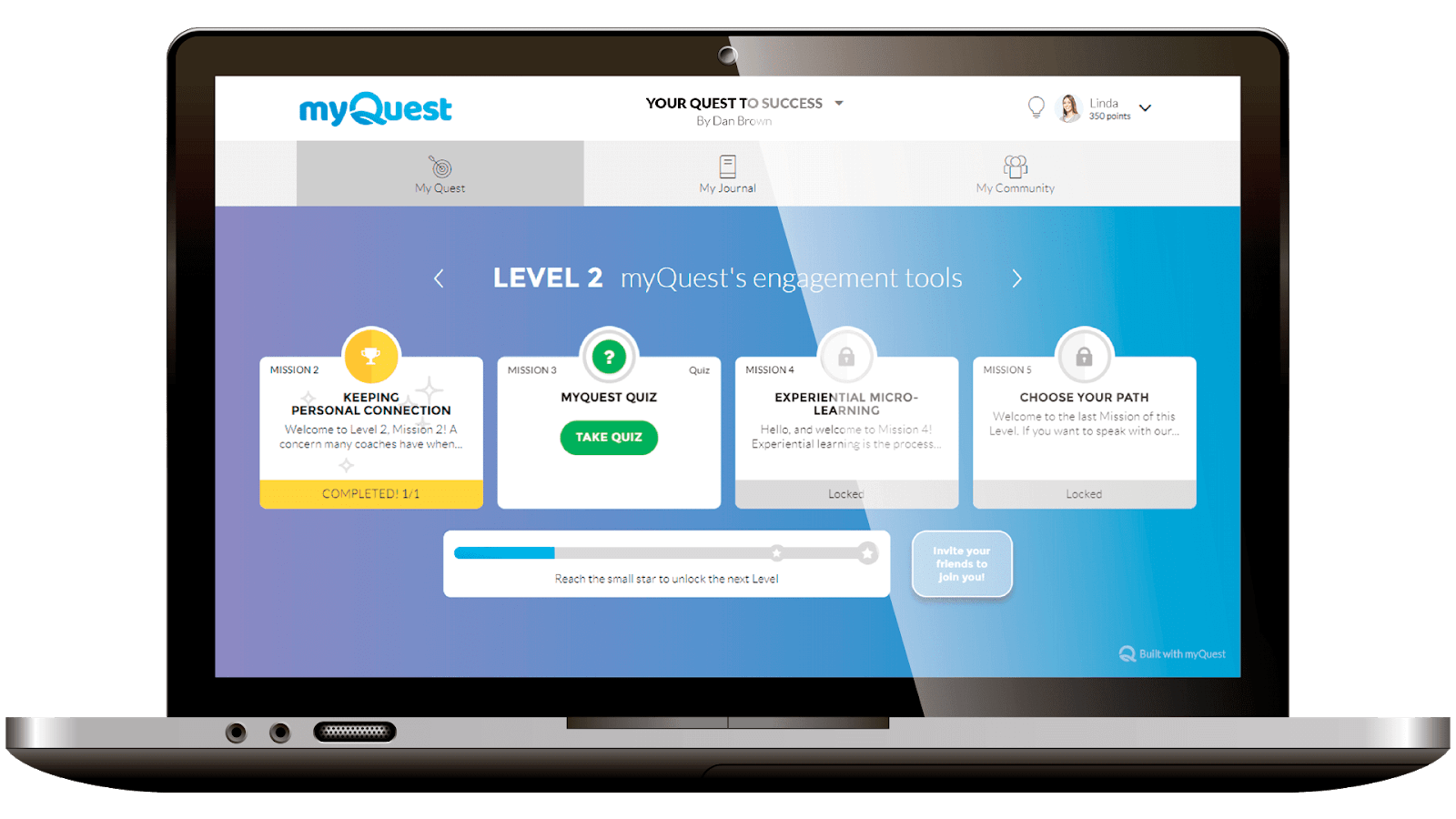 The thing that has been most helpful for Jonathan when delivering learning through myQuest is the structure of the platform and the design of the interface. According to the learning model Jonathan uses, the virtuous cycle of learning, students set a goal, get a bit of information, apply it, then reflect on it, and the cycle begins again. His desire was to find a way to embed this in some kind of learning experience platform. The design of myQuest, where content is broken into Levels and Missions, was a perfect fit for his model and needs.